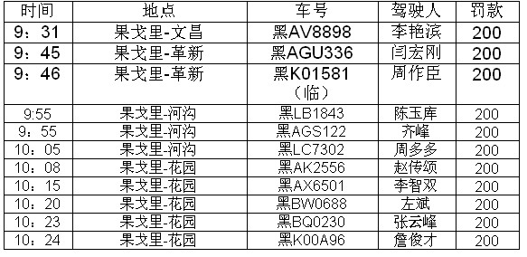 9时30分,记者与交警来到果戈里大街与文昌街路口。据南岗大队二中队中队长李晓冬介绍,果戈里大街实行单向交通后,果戈里大街(文昌街至东大直街),除公交车和19座以上(含19座)大型客车外,其他机动车只准许由南往北单向行驶。果戈里大街(东大直街至一曼街),机动车只准许由南往北单向行驶。交警实际执法中发现仍有车辆闯入单行道逆行。9时31分,一辆黑AV8898号奔驰牌轿车因逆行被交警截下。驾驶人李艳滨说自己刚刚做完按摩,不知道果戈里大街改成单行道,还是一名出租车司机告诉她走错了路,正在掉头的时候被交警取缔。交警依法对其处以200元罚款,一次记3分。9时45分,在果戈里大街与革新街路口,黑AGU336号尼桑牌轿车和黑K01581(临)逆行分别被交警取缔。9时55分,黑LB1843号比亚迪牌轿车逆行被交警截下,驾驶人陈玉库说自己不了解单行道的规定,也没看见有禁止驶入的交通禁令标志,交警依法对其处以200元罚款。10时05分,黑LC7302号银灰色松花江牌微型面包车逆行被取缔。驾驶人周多多下车后很激动:“前面的交警告诉我这里是单行,但是我家就在这里,你们不能不让我回家啊!”交警向他解释可以绕行的路线,对其故意驶入单行道进行了处罚。在上午1个小时中,交警部门在果戈里大街上依法取缔11件逆行的交通违法行为。