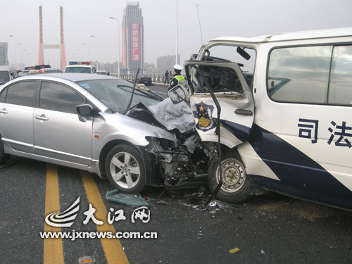今天下午1点40左右,一辆本田(参数图片)思域(参数图片)轿车与一辆警用面包车在八一大桥上相撞