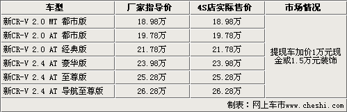 东风本田(参数图片)旗下的CR-V(参数图片)车型自上市以来,一直以其较高的性价比占领着国内家用SUV市场的半壁江山,提现车的加价销售从CR-V上市之日起持续到了现在,CR-V的畅销为同级别车型树立了典范。3月5日东风本田(参数图片)正式推出全新的CR-V,在售价不变的情况下对全系车型进行了配置升级,并推出了导航版车型。那么新车上市后的市场行情是什么样子呢?根据网上车市价格监测系统显示,全新上市的CR-V依然存在加价售车的现象。具体车型售价见下表: