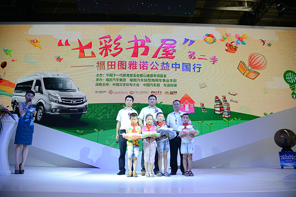 车展现场,福田汽车启动了“七彩书屋”第二季公益中国行活动,旨在为贫困地区的孩子们送去书籍和知识。本季“七彩书屋”的一大创新,就是将图雅诺打造成为“移动书屋”,以移动图书馆的形式,满载书籍,运送到东北各省市、县区,运送到渴求知识的贫困儿童手中,为孩子们搭建起通往知识殿堂的彩虹桥。