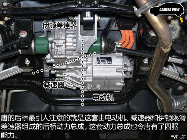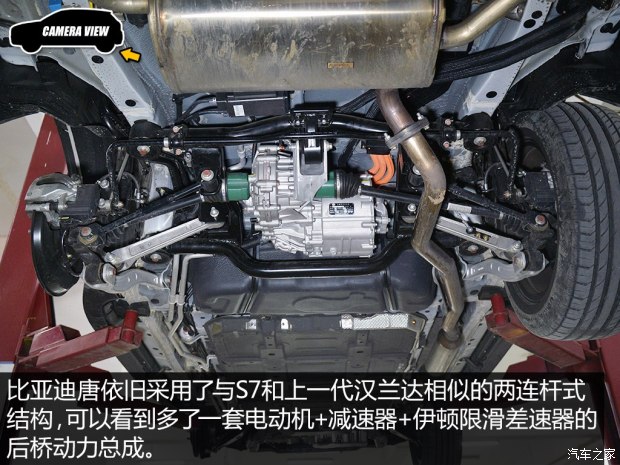 尽管在悬架结构方面依然可以看到之前产品的影子,但唐区别于比亚迪以往SUV产品的特点是其在后桥也布置了一台电动机,因此可以实现电动四驱工况。此外,在后桥动力的传输方面,比亚迪的工程师还为唐安装了一台伊顿机械式限滑差速器,因此在我们的四驱测试中,唐也有着不错的表现。