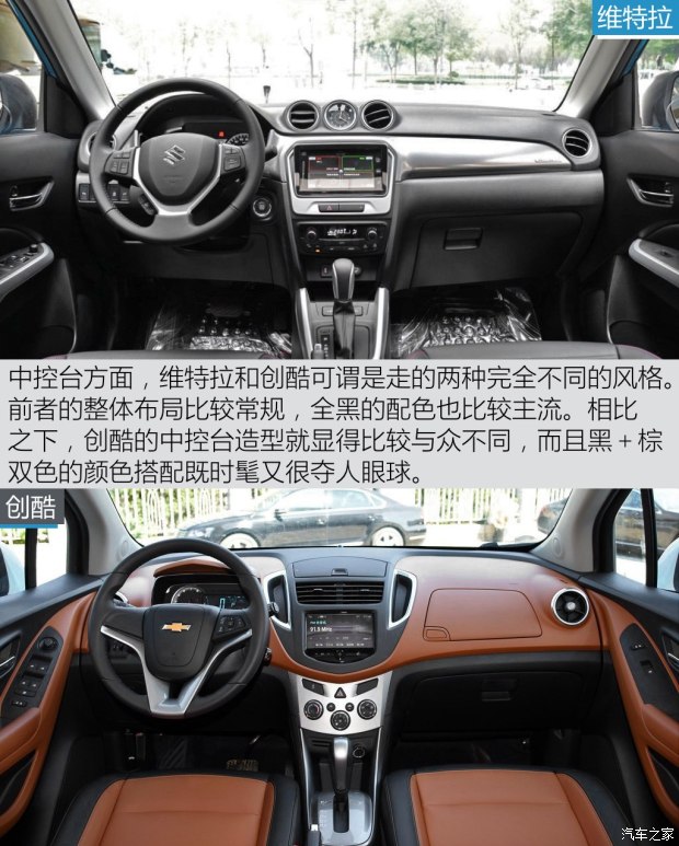 创酷采用棕黑相间的内饰配色方案,加以银色装饰件点缀,整体看起来简洁而且时尚。反观维特拉,内饰采用黑色和银色为主调,虽然在各个构件的设计上看起来颇有科技感,不过整体看起来显得很传统,不及创酷的内饰吸引年轻人的眼球。