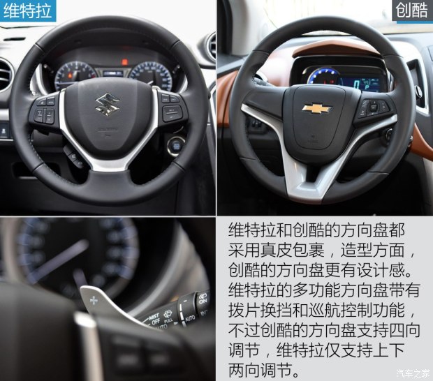 维特拉配备有拨片换挡功能,而且相比创酷,通过它的多功能方向盘还能控制更多的车载系统,如创酷不具备的定速巡航以及CarPlay功能。再看创酷,它的方向盘为四向调节,能够适应不同体型的驾驶者,配置更为人性化。