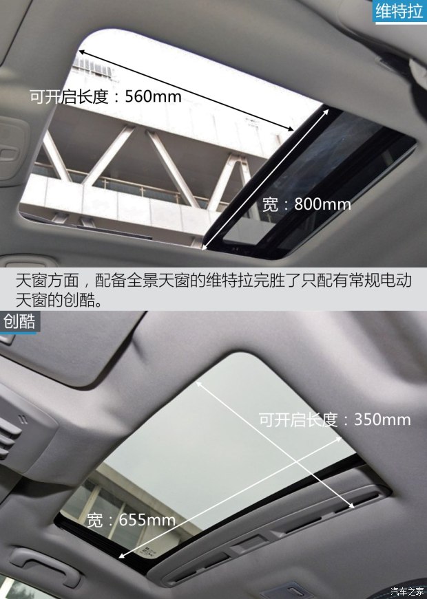天窗的情况也是如此,维特拉配备了尺寸巨大的全景天窗,而创酷配备的则是常规的电动天窗。