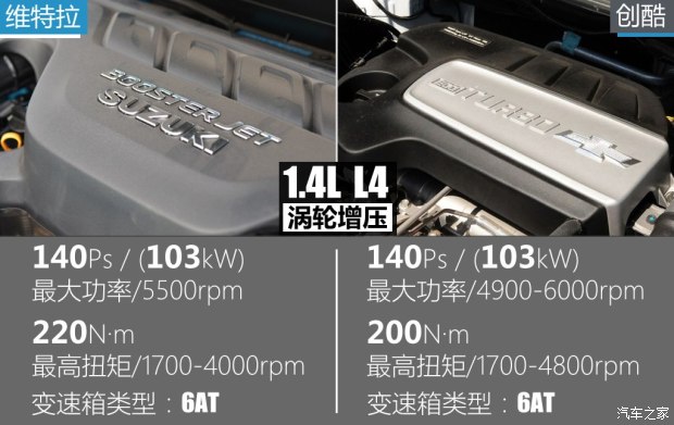 ◆动力系统:伯仲之间原因:两款车配备的发动机均为1.4T涡轮增压发动机,动力参数上很相近,发动机最大功率相同,只是维特拉发动机的扭矩比创酷高上了一点(20N·m)。