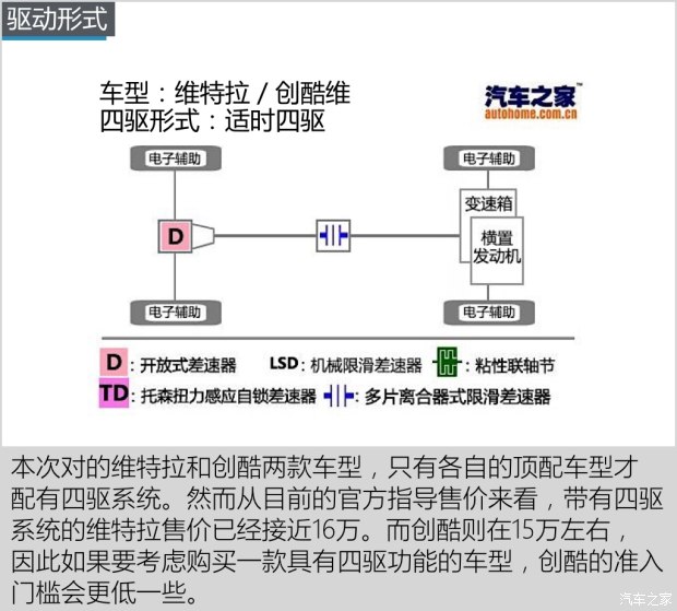 在四驱系统配置上,维特拉和创酷都只有最高配的车型才有所配备,四驱形式均为带电子辅助系统的适时四驱。维特拉顶配车型的售价已经接近16万,而您只需花费不到15万(部分优惠幅度高的地方还不需要那么多……)就能买到一台四驱的创酷,如果只是考虑四驱系统的话,创酷会更合适一些。