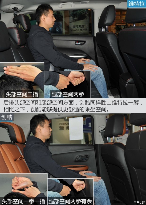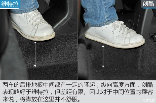 ◆空间对比:各有优势/创酷乘坐空间更好原因:在乘坐空间方面,创酷的前后排乘坐空间比维特拉好,乘坐起来更舒适。不过轴距比创酷短55mm的维特拉前后排也有尚佳的前后排乘坐表现,而且它还在后备厢空间环节完胜了创酷。因此这个环节维特拉和创酷战成平手:需要乘坐空间更大——选创酷;需要后备厢空间更多——选维特拉。