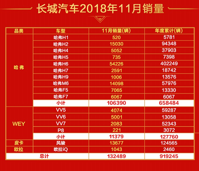 自今年9月以来,作为自主品牌领军者的长城汽车表现愈战愈勇。9月-11月,长城汽车销量每月一个台阶,连续三个月环比大幅增长,9月销售8.7万辆,10月销量突破11万辆,11月更是突破了13万辆大关,达到13.25万辆。今年1-11月,长城汽车已累计销售新车91.92万辆。由此看来,长城汽车2018年突破100万辆大关已板上钉钉。这将是长城汽车继2016年和2017年后,连续第三年整体销量超过百万辆。这一成绩的达成,极大地提振了当前环境下,自主品牌的整体士气。