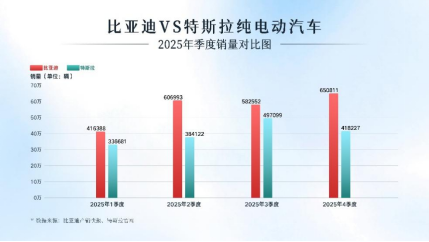 此次超越不仅体现在年度总销量上。市场数据显示,在2025年的四个季度中,比亚迪的全球纯电销量均持续领先于特斯拉,这已是其连续第五个季度实现季度销量超越。这一趋势表明,比亚迪的领先地位并非偶然,而是其综合竞争力持续释放的结果。
