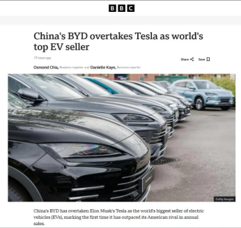 行业分析认为,比亚迪在纯电销量上实现对特斯拉的超越,标志着全球电动汽车产业进入了一个新的阶段。以比亚迪为代表的中国汽车品牌,正凭借在电动化、智能化方面的技术、产品矩阵及供应链管理等方面形成的体系化优势,在全球市场中扮演越来越重要的角色,并持续推动着全球汽车产业向新能源转型的进程。