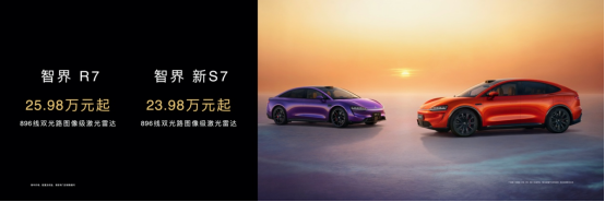 智界R7 896线双光路图像级激光雷达配置,官方建议零售价25.98万元起;智界新S7 896线双光路图像级激光雷达配置,官方建议零售价23.98万元起。2026年5月7日前下定,智界R7可享至高64,000元限时购车权益,智界新S7可享至高74,000元限时购车权益。现已经开启全国交付。
